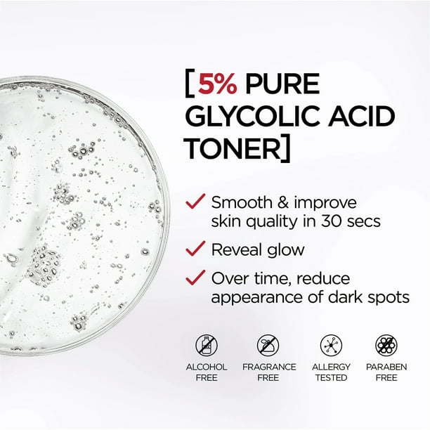 The secret to smooth and glowing skin? Gentle exfoliation in 1 simple step! NEW Revitalift Derm Intensives 5% Pure Glycolic Acid Toner, a daily peeling toner that smooths skin texture and reveals glowing, smoother, brighter skin. How It Works: This daily peeling toner gently yet powerfully exfoliates dead skin cells to smooth skin texture and reveal smoother and brighter skin ready for Derm Intensives Serum application. Effective, low pH formula with: - 5% Pure Glycolic Acid, an alpha hydroxy acid (AHA) recommended by dermatologists as an effective exfoliator to remove dead skin cells and help increase cell turnover to reveal fresher, brighter skin. - Aloe Vera, a botanical extract, helps to soothe and moisturize the skin for daily use. What's New: Dermatologist-Validated* formula with 5% Pure Glycolic Acid and Aloe Vera is designed for daily use and suitable for all skin types, even sensitive skin. Effective for all skin tones. The Result: Immediately skin feels smoother, refreshed and clean. Overall skin quality looks improved. In 1 week, skin feels softer and looks renewed with a healthy glow. Appearance of skin imperfections are reduced. Overtime, dark spots start to visibly improve. New Revitalift Derm Intensives 5% Pure Glycolic Acid Toner is Fragrance Free, Alcohol Free, Paraben Free, Allergy Tested, Dye Free, Mineral Oil Free. Dermatologist tested suitable for sensitive skin. See results or your money back, guaranteed. Money back guarantee, up to $19.99 (sales tax will not be refunded). Restrictions apply. For details, call 1-800-630-5585. Valid in the 50 U.S/D.C. Void where prohibited. Limit 1 refund per person and per household. *An external panel of dermatologists validated that Revitalift Derm Intensives products uphold strict formulation standards and reviewed independent clinical testing results and protocols.